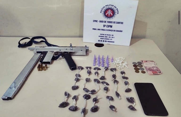 Uma submetralhadora, munições e 73 porções de entorpecentes (cocaína e maconha) foram apreendidas pela 9ª Companhia Independente da Polícia Militar (CIPM/Pirajá). A ação foi realizada no bairro de São Caetano, no sábado (12).