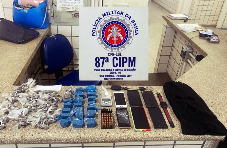Na casa os Policiais Militares encontraram maconha, cocaína, munições, seis telefones celulares, material utilizado no tráfico de drogas, uma touca ninja e três chaves de veiculo.